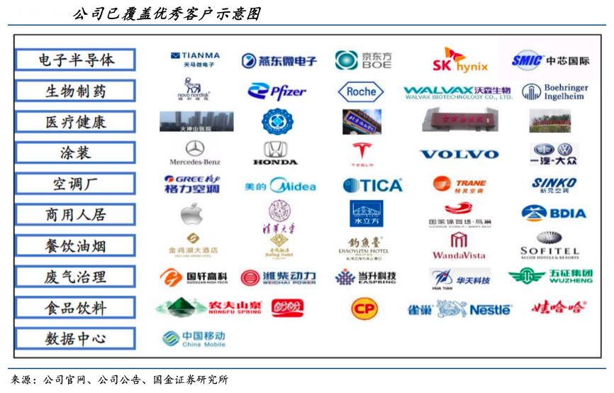 經典案例:根據公司官網、公司招股說明書、國金證券研究所等綜合資訊表明,美埃科技公司產品下游涉及多行業場景。(1)FFU+過濾器應用于半導體、生物制藥、食品加工等行業的潔凈廠房及潔凈室中;(2)空氣凈化設備用于生物制藥產線(生物安全、無菌凈化設備)、室內空氣凈化(商用、醫用、家用空氣凈化機)、工業生產(工業除塵設備/除油霧設備)、餐飲場景(除油煙凈化器)。