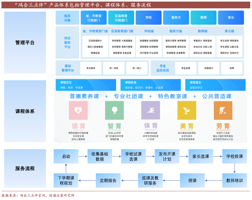 經典案例:根據鴻合三點伴官網、財通證券研究所等綜合資訊表明,鴻合科技公司面向 K12 階段推出“鴻合三點伴”課后服務業務,為管理部門、學校、家長、老師、服務機構提供規范管理、高效運營的云平臺,以及“德、智、體、美、勞”五育并舉所需要的優質稀缺性課程,同時為客戶提供標準化、精細化的課后運營服務。