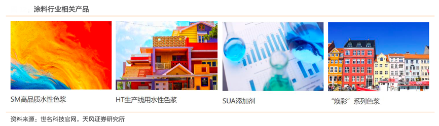 經典案例:根據世名科技官網、天風證券研究所等綜合資訊表明,世名科技公司為國內色漿行業的龍頭企業,建筑涂料色漿、膠乳類色漿等產 品在下游細分市場均處于領先地位,該部分產品屬于公司成熟的業務板塊。