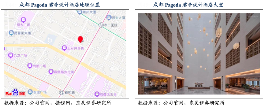 經典案例:根據公司官網、攜程網、東吳證券研究所等綜合資訊表明,成都 Pagoda 于 2022 年 3 月 開業,成都 Pagoda 大堂結合現代 AR 交互技術,展 示林俊廷先生作品《鎏瑩》,中庭采用獨特孔明燈設計,營造中式設計氛圍。