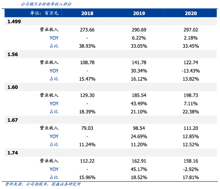 經典案例:根據公司招股書、國盛證券研究所等綜合資訊表明,耐特光學高折射率鏡片占比穩步提升,高端化趨勢明確。公司鏡片覆蓋 1.499-1.74 折射率范圍,2020年 1.499/1.56/1.60/1.67/1.74 折射率鏡片收入占比分別為 33.5%/13.8%/22.4%/12.5%/17.8% , 2018-2020 年 CAGR 分 別 為 4.2%/6.2%/24.0%/18.6%/18.7%,高折射率鏡片增速快于整體。