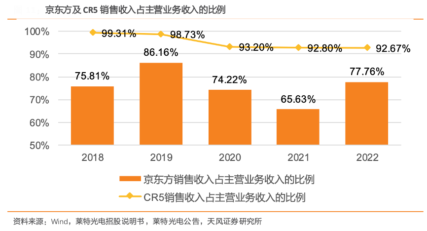 經典案例:根據wind、萊特光電招股說明書、萊特光電公告、天風證券研究所等綜合資訊表明,自 2018 年至 2022 年,京東方得益于其在 OLED 小尺寸顯示面板領域所擁有的全球第二、國內領先的顯著市場優(yōu)勢,始終占據公司核心客戶的地位。同時,公司前五大客戶(CR5)的銷售占比雖然自 2018 年以來呈現(xiàn)出逐年遞減的趨勢,表明公司正在積極拓展新客戶基礎,但至 2022 年,這一 集中度依然高達 92.67%,反映了公司客戶結構相對集中的現(xiàn)狀。