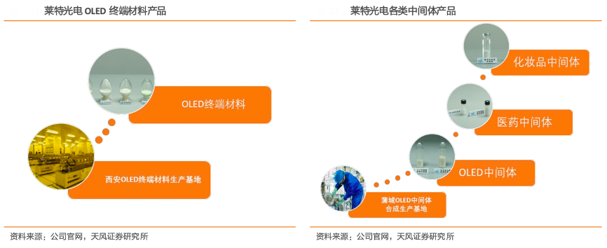 經典案例:根據公司官網、天風證券研究所等綜合資訊表明,陜西萊特光電材料股份有限公司主要從事 OLED 有機發(fā)光材料的研發(fā)、生產和銷售,是一家集產學研一體化的國家級高新技術企業(yè),經過十四年發(fā)展,實現(xiàn)了 OLED 有機材料的設計、中間體合成、升華前材料制備、終端材料生產和器件制備與評測的全產業(yè)鏈運營,具備堅實的研發(fā)實力。