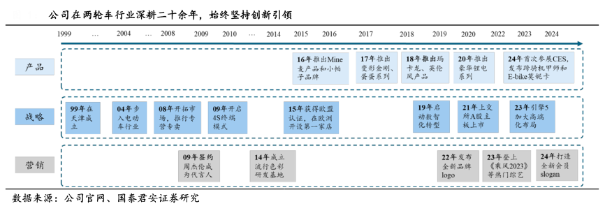 經(jīng)典案例:根據(jù)公司官網(wǎng)、國(guó)泰君安證券研究等綜合資訊表明,2015年愛(ài)瑪科技公司出口 國(guó)際市場(chǎng)并獲得歐盟認(rèn)證,2021年在 A 股上市,2022 年全年銷量突破 1000 萬(wàn)輛,并于 2023 年登上《乘風(fēng) 2023》等熱門綜藝。公司緊緊圍繞“用戶至上、卓越產(chǎn)品、精耕市場(chǎng)、精細(xì)運(yùn)營(yíng)”的戰(zhàn)略主軸和向數(shù)智化科技公司轉(zhuǎn)型的戰(zhàn)略方向,持續(xù)專注于電動(dòng)兩輪車研發(fā)與生產(chǎn)。