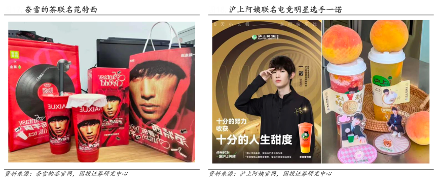 經典案例:根據奈雪的茶官網、滬上阿姨官網、國投證券研究中心等綜合資訊表明,2023 年 9 月,在周杰倫《范特西》專輯發行 22 周年之際,奈雪的茶聯名薄盒上線范特西音樂宇宙系列聯名產品,同時還推出了 CD 造型的杯墊、印有周杰倫專輯封面的不銹鋼杯子和手提袋,引發了一波打卡熱潮。在 2023 年 亞運會開幕前夕,滬上阿姨就邀請了一諾擔任鮮果茶體驗官,消息已經發出一度刷屏了電競愛好者的社交媒體。