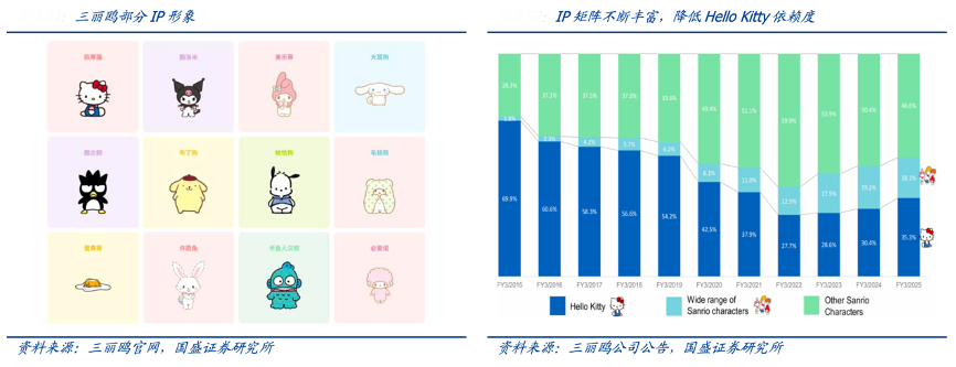 經(jīng)典案例:根據(jù)三麗鷗官網(wǎng)、三麗鷗公司公告、國盛證券研究所等綜合資訊表明,近年來,三麗鷗公司不斷加強(qiáng) IP 矩陣建設(shè),2020年三麗鷗旗下的 IP 形象已達(dá) 450 個(gè),通過線上內(nèi)容運(yùn)營提高酷洛米、玉桂狗等角色的熱度,三麗鷗家族的占比已經(jīng)從 FY2015 的 1.8%提升至 FY2025 的 18.1%。