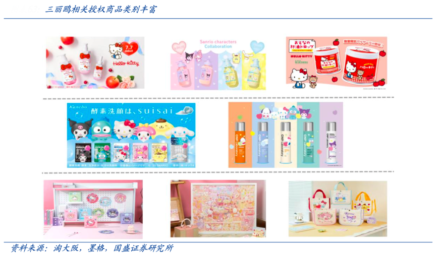 經(jīng)典案例:根據(jù)淘大阪、墨格、國盛證券研究所等綜合資訊表明,以中國市場為例,阿里魚 2024 年為三麗鷗創(chuàng)作完成 50 多套圖庫內(nèi)容,2024 年三麗鷗復(fù)數(shù)角色與超 200 家品牌達(dá)成授權(quán)合作,累計(jì) 3 萬余款 SKU 新品投入市場。